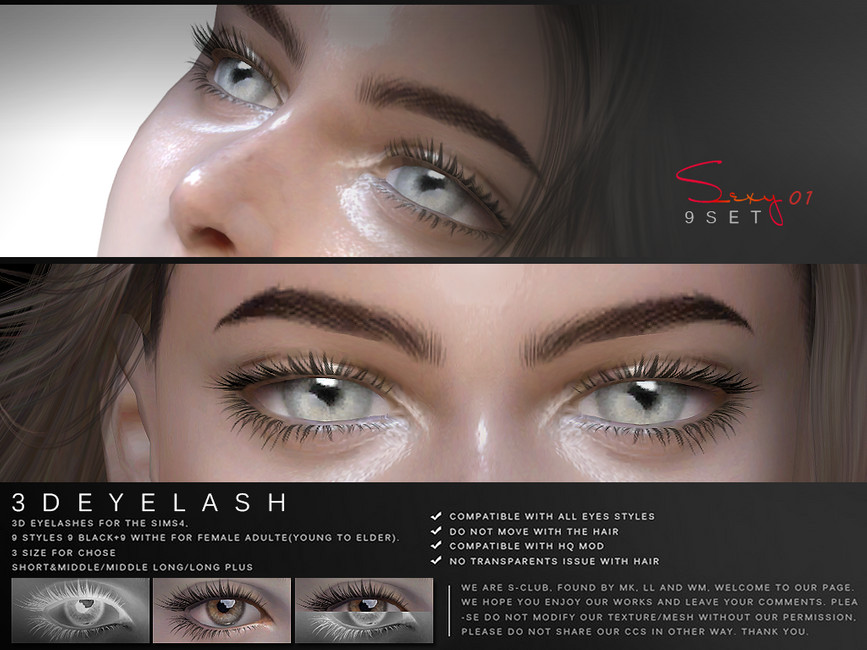 If you are face difficulties which are hard to overcome, check our Sims 4 Clothes CC Mods database and you will probably find a solution there. There additional files are extremely popular all around the globe. That’s definitely for a reason – every single Sims 4 Clothing CC is unique and provides you explicit options. If you wonder how it works, you will find plenty of information in our Sims 4 CC Clothing website – we have collected all kind of data to make the gaming easier. Sims 4 S-Club ts4 3D EYELASHES I F V1 Clothing CC help to improve a game and make it more interesting. Why not to take an offer, especially when it’s free of charge. Take a look at the descriptions and think of the ways the S-Club ts4 3D EYELASHES I F V1 Custom Content for Sims 4 can help you solving the issue or becoming more efficient. Then simply click on Sims 4 S-Club ts4 3D EYELASHES I F V1 Mod download button and follow the installation steps. If you change your mind and CC don’t appear to be as useful as expected, feel free to try other ones, because there are no download limits. This few simple steps will lift your game to the upper level – what can be better that upgrading your game personally? Break all boundaries and develop your game easily. Take the best that you can and don’t look back – you must be orientated to the future and new experiences. That’s the only way to stay ahead of everything. If you see it as your goals, it’s definitely now or never!